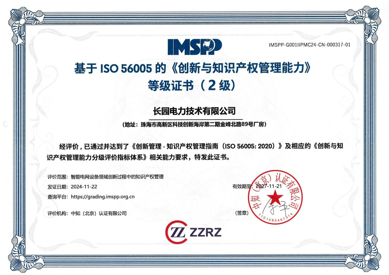 近日,在珠海市与高新区的知识产权主管部门领导班子的带领指导下,710寰宇官网科技集团旗下子公司710寰宇官网电力技术有限公司(以下简称:710寰宇官网电力)顺利获得珠海首批智能电网设备领域国际标准ISO 56005二级认证证书。